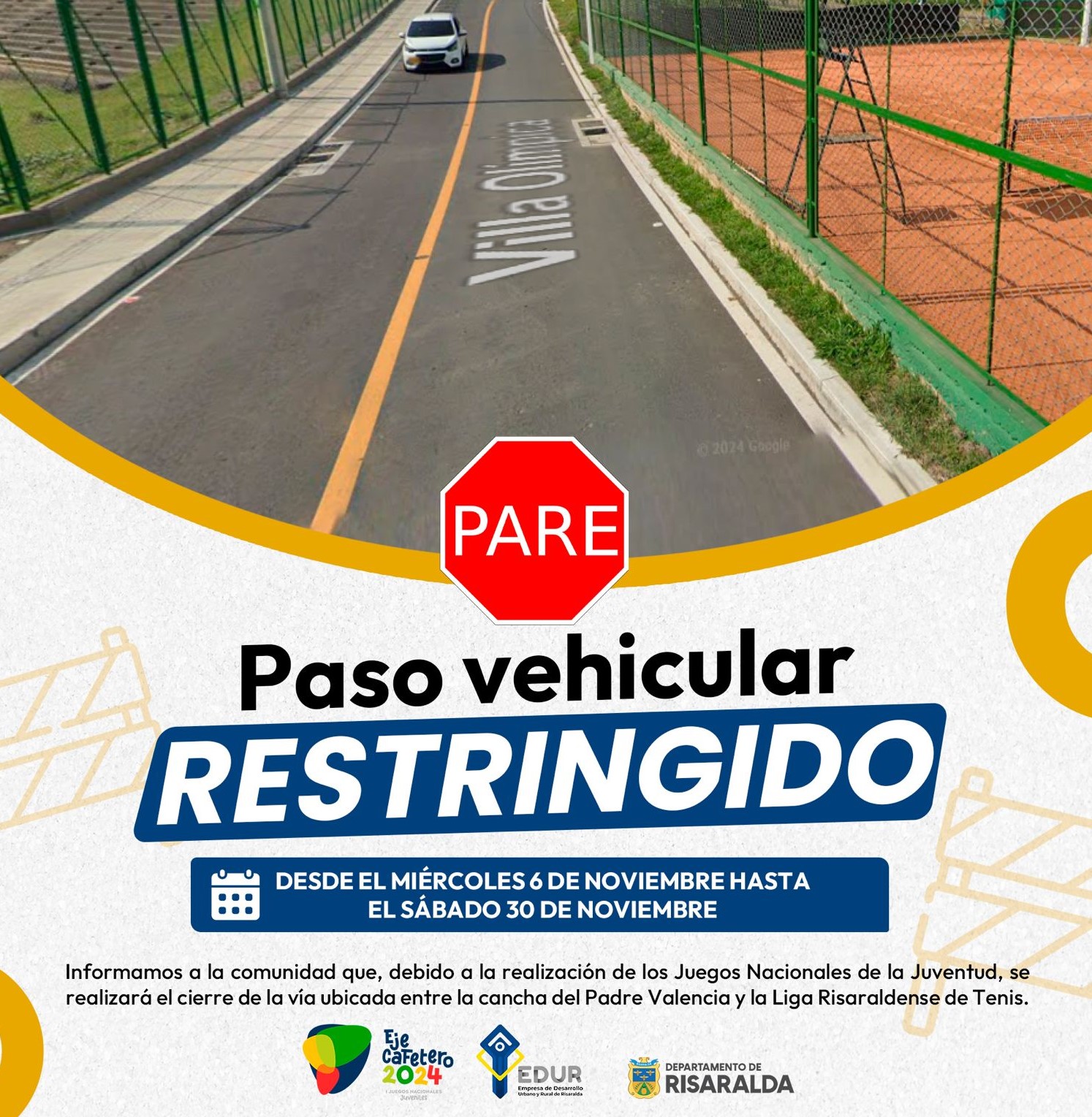 Desde el miércoles 6 de noviembre hasta el sábado 30 de noviembre de 2024. La Gobernación de Risaralda informa a la comunidad que, debido a la realización de los Juegos Nacionales de la Juventud, se realizará el cierre de la vía ubicada entre la cancha del Padre Valencia y la Liga Risaraldense de Tenis.